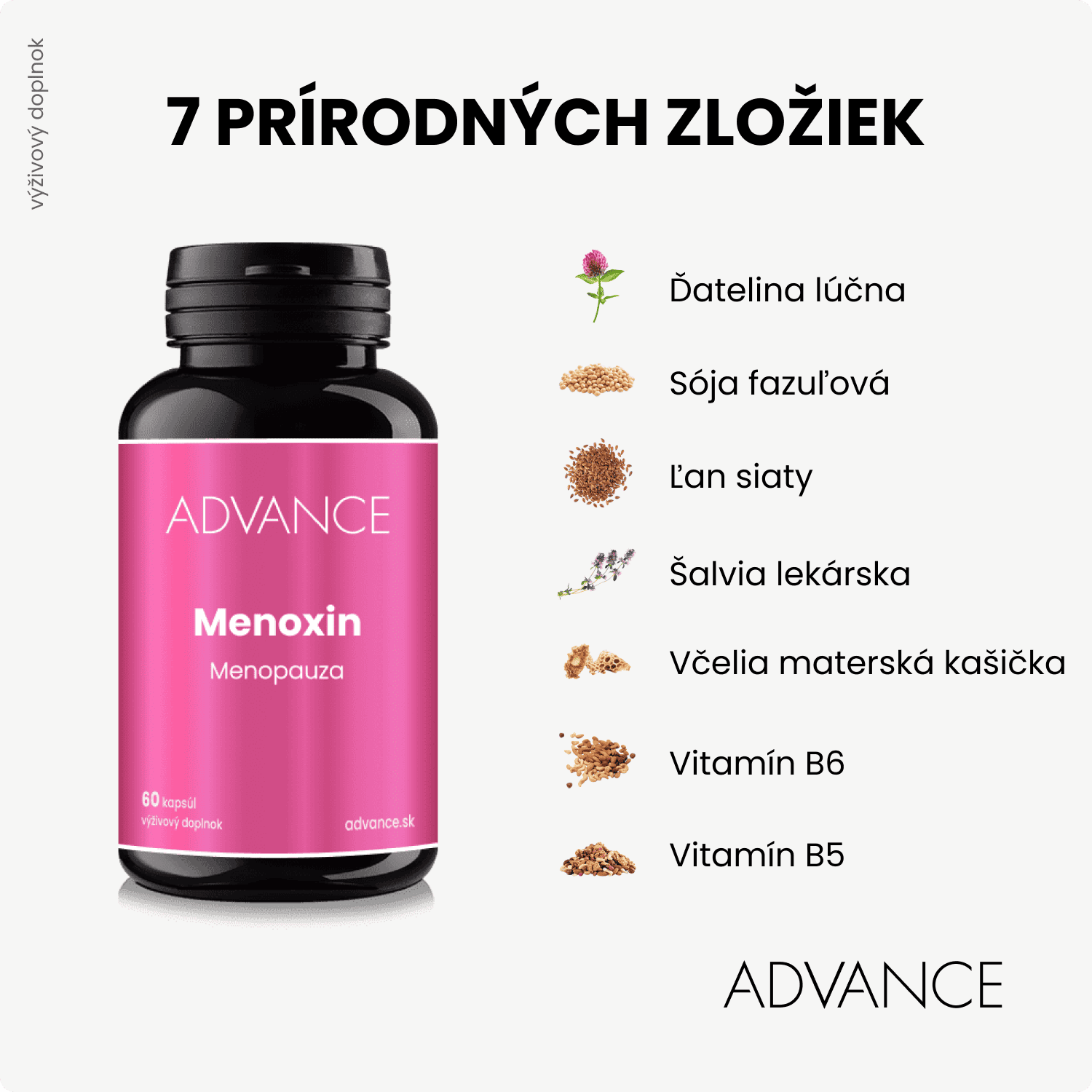 Menoxin je úplne unikátny svojím zložením. Prírodné extrakty ďateliny lúčnej, sóje fazuľovej, ľanu siateho, šalvie lekárskej, včelej materskej kašičky, vitaminu B6 a kyseliny pantoténovej zaisťujú maximálny synergický efekt.