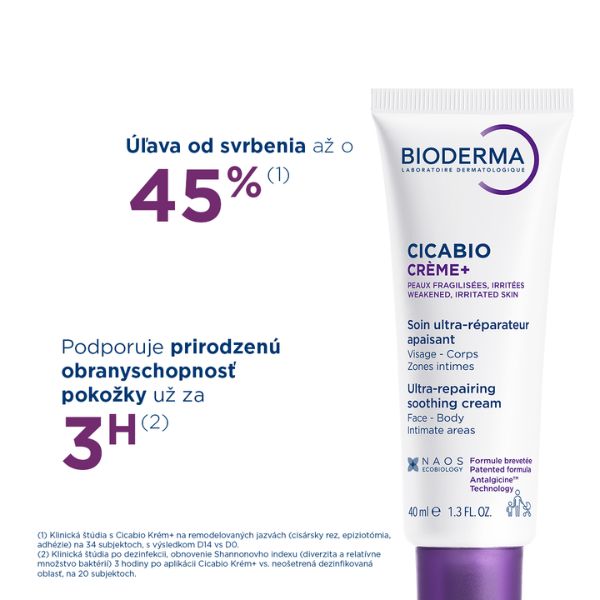 : Cicabio Krém+ je 1. eko-biologický a regeneračný upokojujúci krém, ktorý pomáha zabezpečiť optimálny proces hojenia a pomáha pokožke vrátiť sa do pôvodného stavu. Vhodný pre celú rodinu (vrátane novorodencov, okrem predčasne narodených detí).