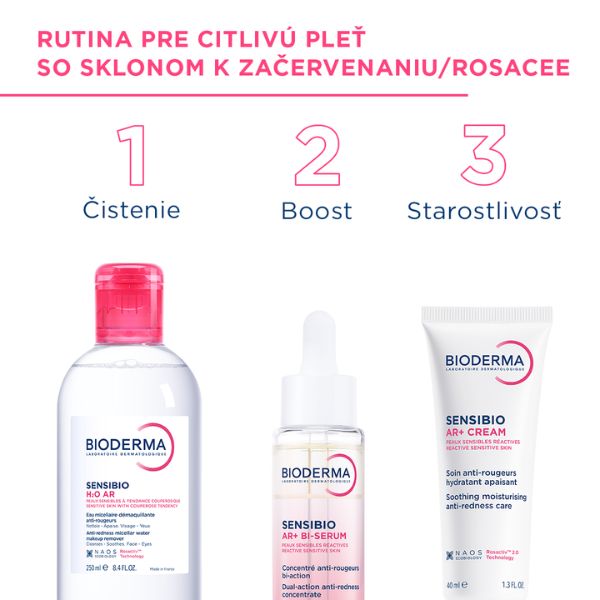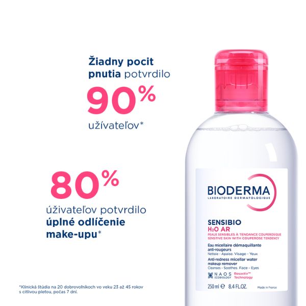Sensibio H2O AR je 1. micelárna voda na odstraňovanie make-upu, ktorá napodobňuje prirodzené zloženie pokožky – zaisťuje tak dokonalé odstránenie make-upu a plne rešpektuje požiadavky aj najcitlivejšej pleti. Takisto inhibuje začervenanie biologickou reguláciou faktora zodpovedného za vazodilatáciu.