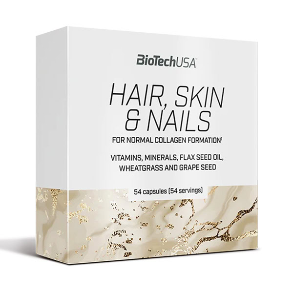 BioTechUSA Hair, Skin & Nails je komplexný výživový doplnok v praktickom blisterovom balení, ktorý spája silu 10 vitamínov, 3 minerálov, L-metionínu a vybraných rastlinných extraktov na podporu krásy zvnútra. Zinok a selén prispievajú k udržaniu normálneho stavu vlasov, pokožky i nechtov, vitamín C podporuje tvorbu kolagénu pre pevnosť pokožky, vitamín A, riboflavín a niacín chránia pred predčasným starnutím, zatiaľ čo meď zabezpečuje rovnomernú pigmentáciu a elastické spojivové tkanivá. Pridaný L-metionín podporuje obnovu keratínu vo vlasoch a nechtoch, zmes ľanového oleja, pšeničnej trávy a hroznového oleja obohatená o proantokyanidíny poskytuje ďalšiu antioxidačnú ochranu a vyživuje bunky zvnútra. Jedna denná dávka pokrýva všetky kľúčové mikronutrienty potrebné na dosiahnutie zdravého rastu vlasov, pevných nechtov a žiarivej, pružnej pokožky.