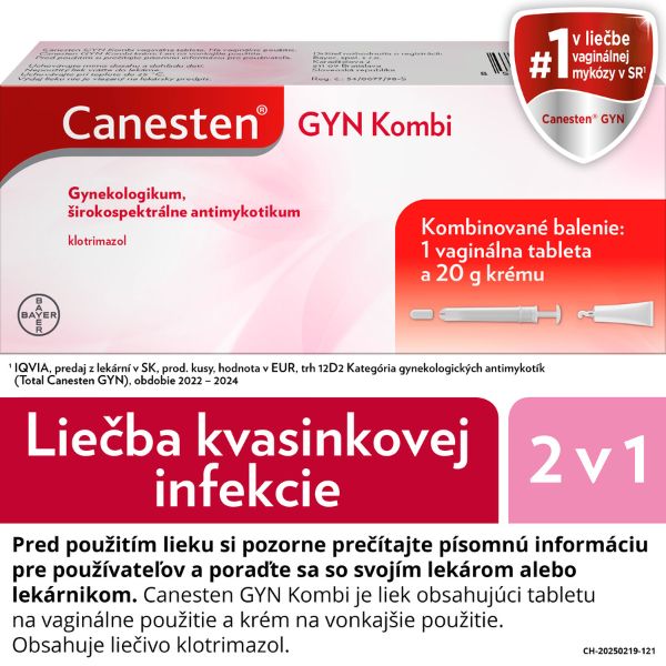 Canesten GYN Kombi je liek obsahujúci tabletu na vaginálne použitie a krém na vonkajšie použitie. Obsahuje liečivo klotrimazol.