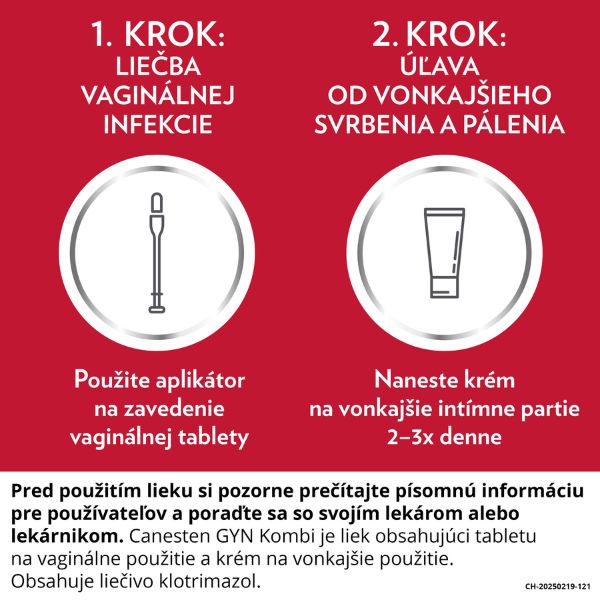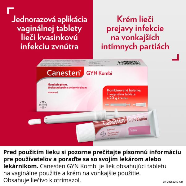Canesten GYN Kombi je určený na komplexnú liečbu kvasinkovej infekcie, a tým uľavuje od pocitu svrbenia. Predstavuje komplexný spôsob liečby, ktorý lieči kvasinkovú infekciu priamo v pošve a zároveň aj na vonkajších intímnych partiách. Je teda vhodný na kombinovanú liečbu vnútorných aj vonkajších prejavov kvasinkovej infekcie.