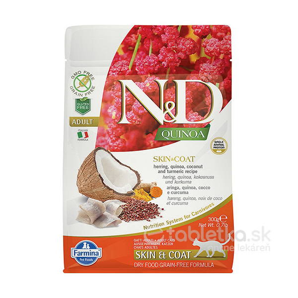 Suché krmivo Farmina N&D cat QUINOA (GF) SKIN & COAT adult (herring & coconut) je kompletná dietetická potravina určená na zlepšenie stavu kože i srsti. Možno ju zahrnúť aj do eliminačnej diéty pri kožných prejavoch alergie/intolerancie.. V prípade pretrvávajúcich alebo zhoršujúcich sa ťažkostí či pridružených problémov sa však o jej použití radšej poraďte s veterinárnym lekárom.