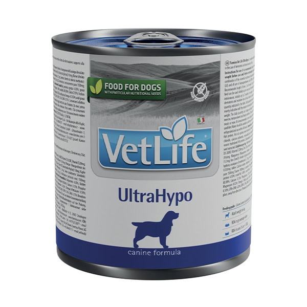 Farmina Vet Life Dog UltraHypo (konzerva) je plnohodnotné diétne krmivo pre psov, navrhnuté na zmiernenie intolerancie voči určitým zložkám a živinám, ako aj na použitie v eliminačnej diéte. Okrem toho podporuje zdravie kože pri dermatózach a nadmernom vypadávaní srsti. Krmivo ponúka vyváženú kombináciu základných živín, pričom je obohatené o vysoké množstvo kyseliny linolovej (LA), eikosapentaénovej (EPA) a dokosahexaénovej (DHA). Tieto zložky významne prispievajú k udržiavaniu zdravej kožnej bariéry a kvalitnej srsti.