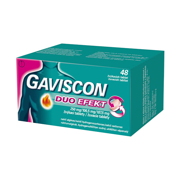 Žuvacie tablety obsahujú kombináciu dvoch antacíd (uhličitanu vápenatého a hydrogenuhličitanu sodného) a alginátu, ktoré: