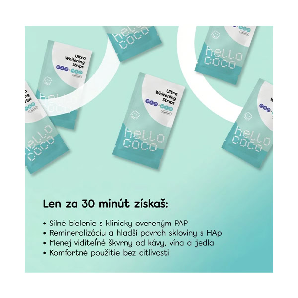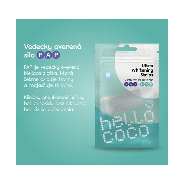 Hello Coco PAP Ultra bieliace pásiky na zuby sú ideálnym riešením pre všetkých, ktorí túžia po viditeľne belších zuboch bez použitia peroxidu a nepríjemných vedľajších účinkov. Pásiky využívajú pokrokový PAP bieliaci vzorec s klinicky overenými výsledkami, obsahujúci vysoko koncentrované účinné látky. Už po prvom použití zabezpečujú rýchle a efektívne výsledky, pričom sú jemné k sklovine aj ďasnám.