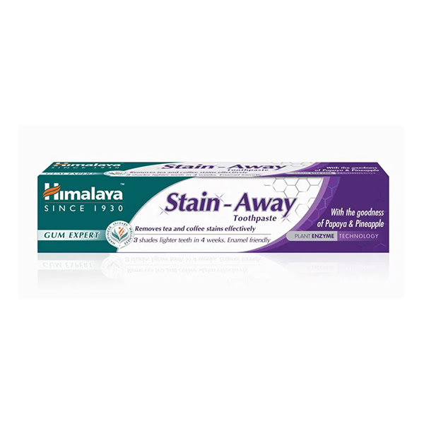 Krabička Himalaya Zubná pasta Stain-Away Toothpaste 75 ml s enzýmami papáje a ananásu na odstránenie škvŕn od čaju a kávy.