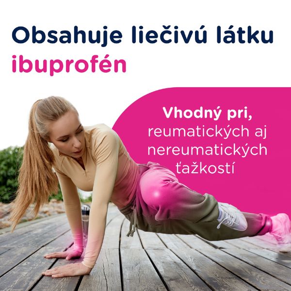 Žena v športovom oblečení sa na vonkajšom priestranstve naťahuje pri krabičke a tube Ibalgin DUO EFFECT krém 100g, v pozadí slovenský text o úľave od bolesti.