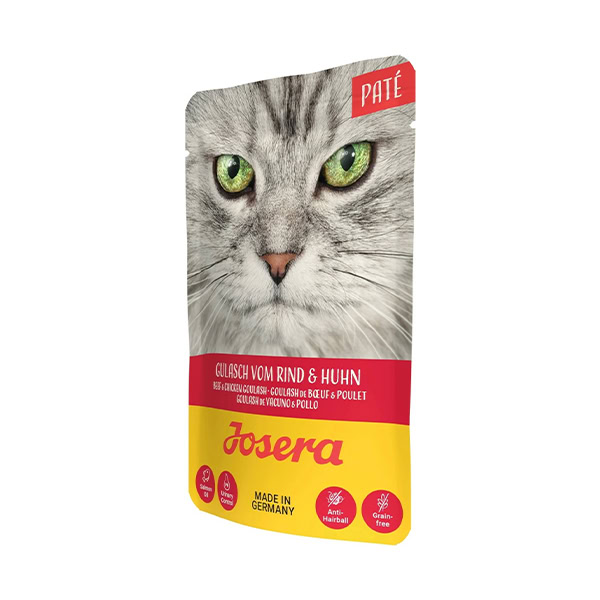 Josera PATÉ je chutné mokré krmivo pre mačky vo forme jemnej paštéty, ktorá spája prémiové hovädzie a kuracie mäso s kúskami mrkvy pre ešte atraktívnejšiu chuť a lepšiu stráviteľnosť.