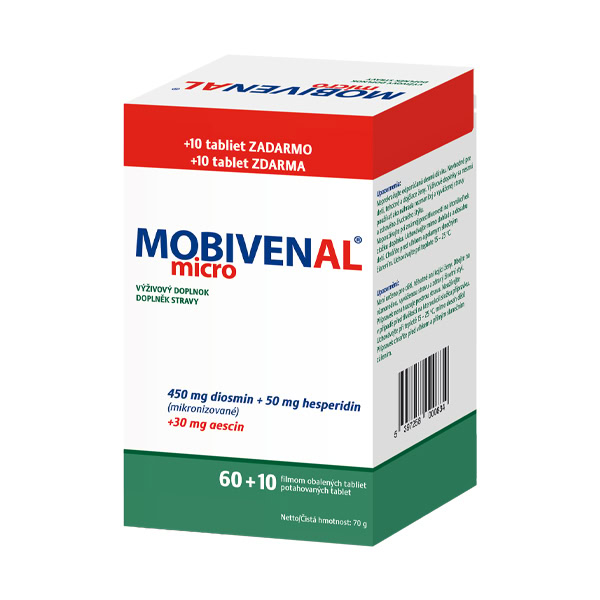 Výživový doplnok Mobivenal micro, hlavnými zložkami tohto prípravku sú mikronizovaný diosmin s hesperidínom a aescin, získaný z plodov pagaštanu konského.