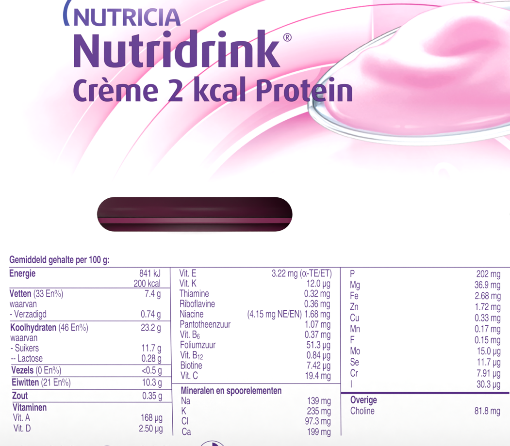Nutridrink Crème 2 kcal Proteín je špeciálne vyvinutý nutričný doplnok určený na pokrytie špecifických výživových potrieb pacientov s rizikom podvýživy alebo s vyššími nárokmi na príjem energie a bielkovín. Táto vysokoenergetická výživa je obohatená o vysoký obsah bielkovín, ktoré podporujú regeneráciu, obnovu svalovej hmoty a celkové zotavenie organizmu.