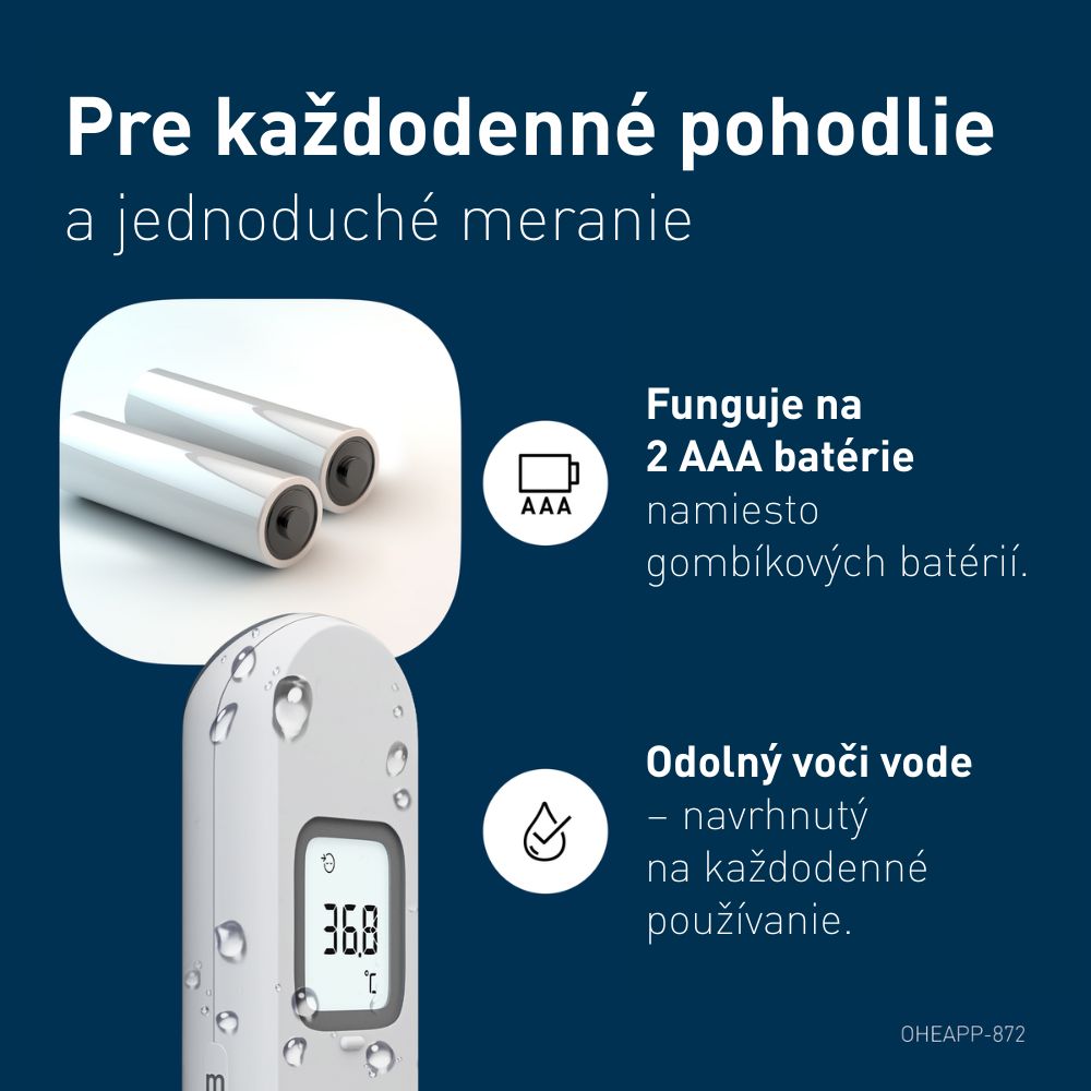 Teplomer disponuje pokročilým senzorom vzdialenosti, ktorý zabezpečuje správne umiestnenie prístroja pre presné výsledky. Jeho ovládanie je intuitívne a meranie pohodlné – či už pri samostatnom používaní alebo pri meraní teploty u detí a seniorov. Podsvietený displej umožňuje ľahké čítanie výsledkov aj v tme. Pre opakované meranie, napríklad po podaní lieku, stačí len 1 sekunda na ďalšie použitie.