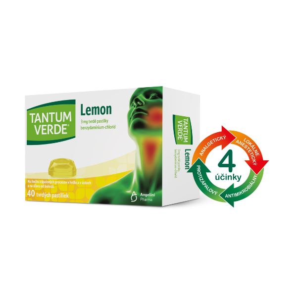 Benzydamín chlorid sa používa lokálne na znecitlivenie podráždeného hrdla a na úľavu od bolesti hrdla. Málokto však vie, že hydrochloridová soľ v pastilkách TANTUM VERDE Lemon je taktiež (na rozdiel od iných podobných liekov) i lokálne pôsobiace nesteroidné protizápalové liečivo (NSAID) odporúčané na protizápalovú liečbu ústnej dutiny a hrdla. Špecificky pôsobí na lokálne mechanizmy zápalu, ako je bolesť, edém (opuch) alebo granulóm (uzlík), dokáže tlmiť tvorbu hnisu a dokonca vykazuje účinnosť proti niektorým bakteriálnym kmeňom.1,2