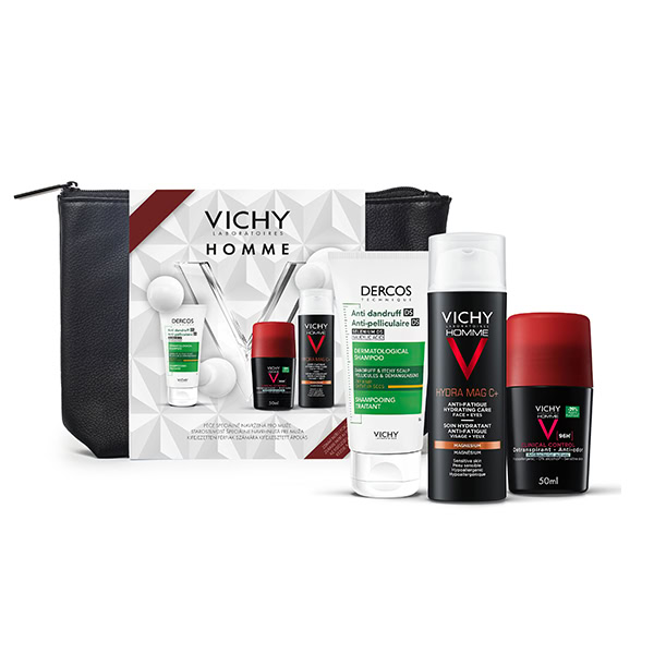 VICHY Homme Hydra Mag C+ hydratačný krém: aqua, glycerin, alcohol denat., propanediol, dimethicone, phenyl trimethicone, propylene glycol, c13-14 isoparaffin, ci 15985, ci 77891, ci 77492, ci 77491, ci 77499, triethanolamine, triethyl citrate, silica [nano], sodium dextran sulfate, escin, phenoxyethanol, magnesium sulfate, magnesium ascorbyl phosphate, boron nitride, ascorbyl glucoside, caprylyl glycol, laureth-7, acrylates/c10-30 alkyl acrylate crosspolymer, polyacrylamide, acrylates/ammonium methacrylate copolymer, parfum. VICHY Homme Deo Clinical Control 96H antiperspirant: aqua / water / eau, aluminum chlorohydrate, dimethicone, c14-22 alcohols, parfum / fragrance, steareth-100/peg-136/hdi copolymer, perlite, tetrasodium glutamate diacetate, c12-20 alkyl glucoside, pentylene glycol. VICHY Dercos šampón proti lupinám: aqua / water, sodium laureth sulfate, glycol distearate, dimethicone, coco-betaine, glycerin, carbomer, ci 19140 / yellow 5, citric acid, menthol, 2-oleamido-1,3-octadecanediol, ppg-5-ceteth-20, salicylic acid, selenium sulfide, sodium benzoate, sodium chloride, sodium hydroxide, tocopheryl acetate, parfum / fragrance.