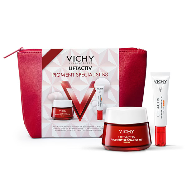 VICHY Liftactiv Pigment Specialist B3 Xmas 2025 je prémiový darčekový set navrhnutý na kompletnú starostlivosť proti pigmentovým škvrnám, vráskam a známkam unavenej pleti. Kombinácia denného krému s vysokou ochranou SPF a očného krému špeciálne vytvoreného pre citlivé očné okolie poskytuje účinné riešenie v boji proti starnutiu pokožky a jej nerovnomernému tónu.